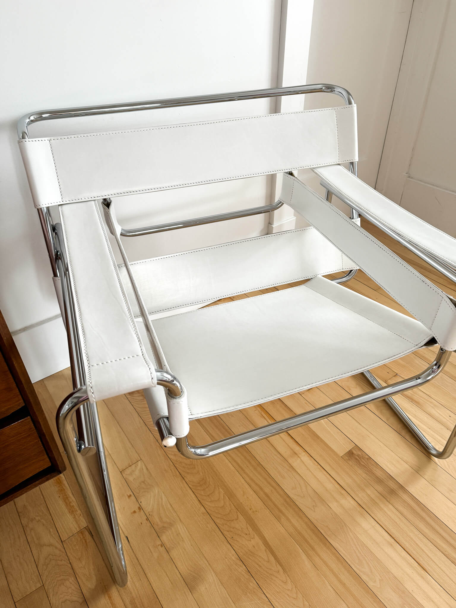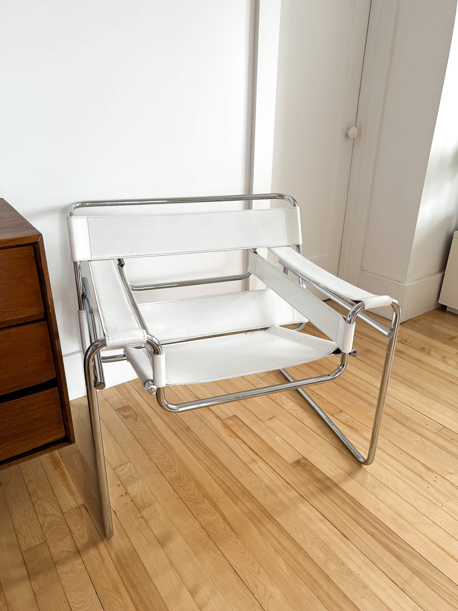 Chaise Wassily en cuir véritable blanc avec tubulure chromé.