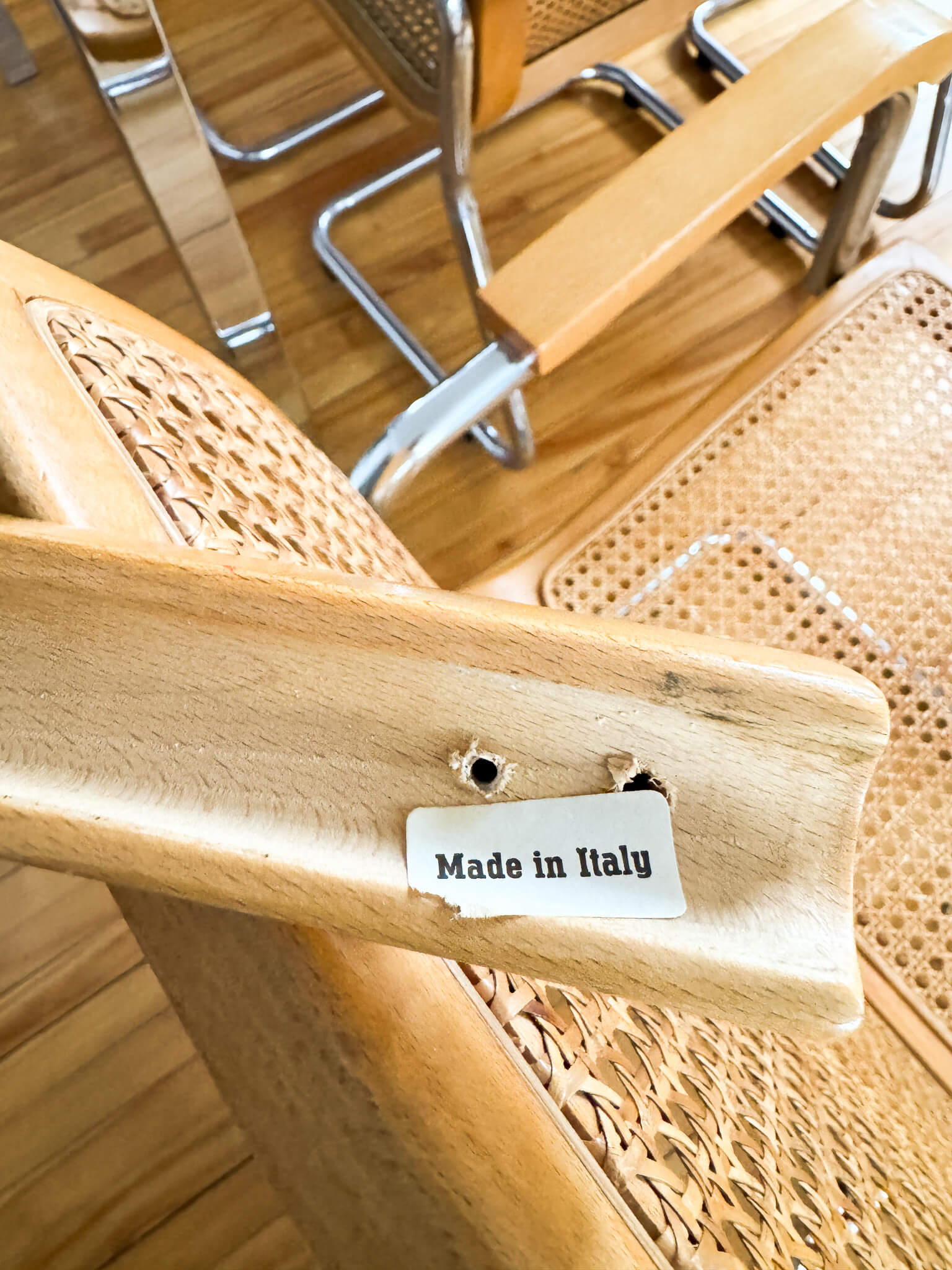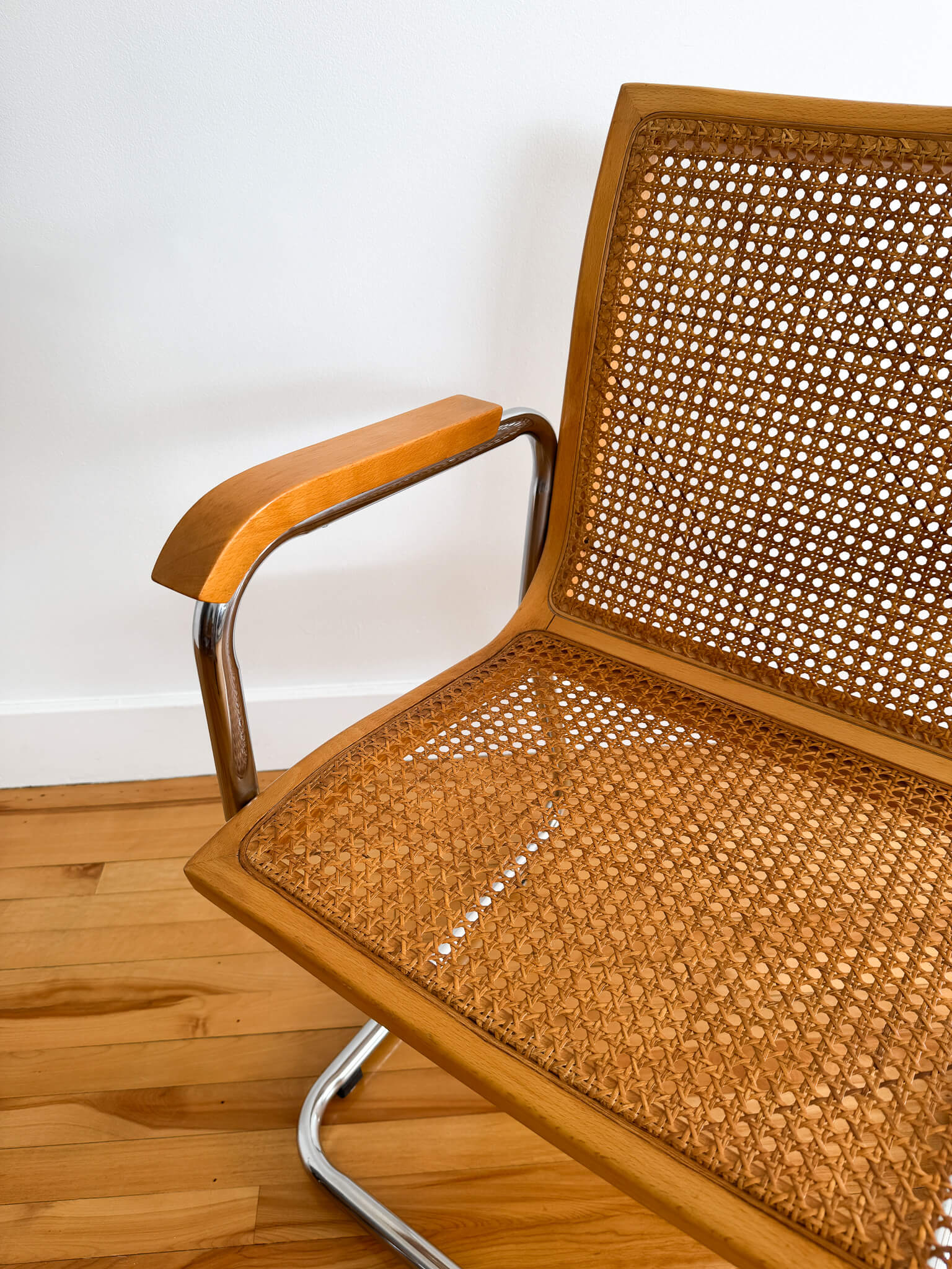 Les chaises sont dans le style Cesca, designé par Marcel Breuer, mais il s'agit d'un modèle beaucoup plus rare, où le dossier et l'assise sont combinés et moulés. Datant également des années 70, elles ont été fabriquées en Italie. Elles sont formées d'une belle structure tubulaire en acier chromé, d'accoudoirs en bois, de cannage, ainsi que d'une assise-dossier moulée et courbée en bois.