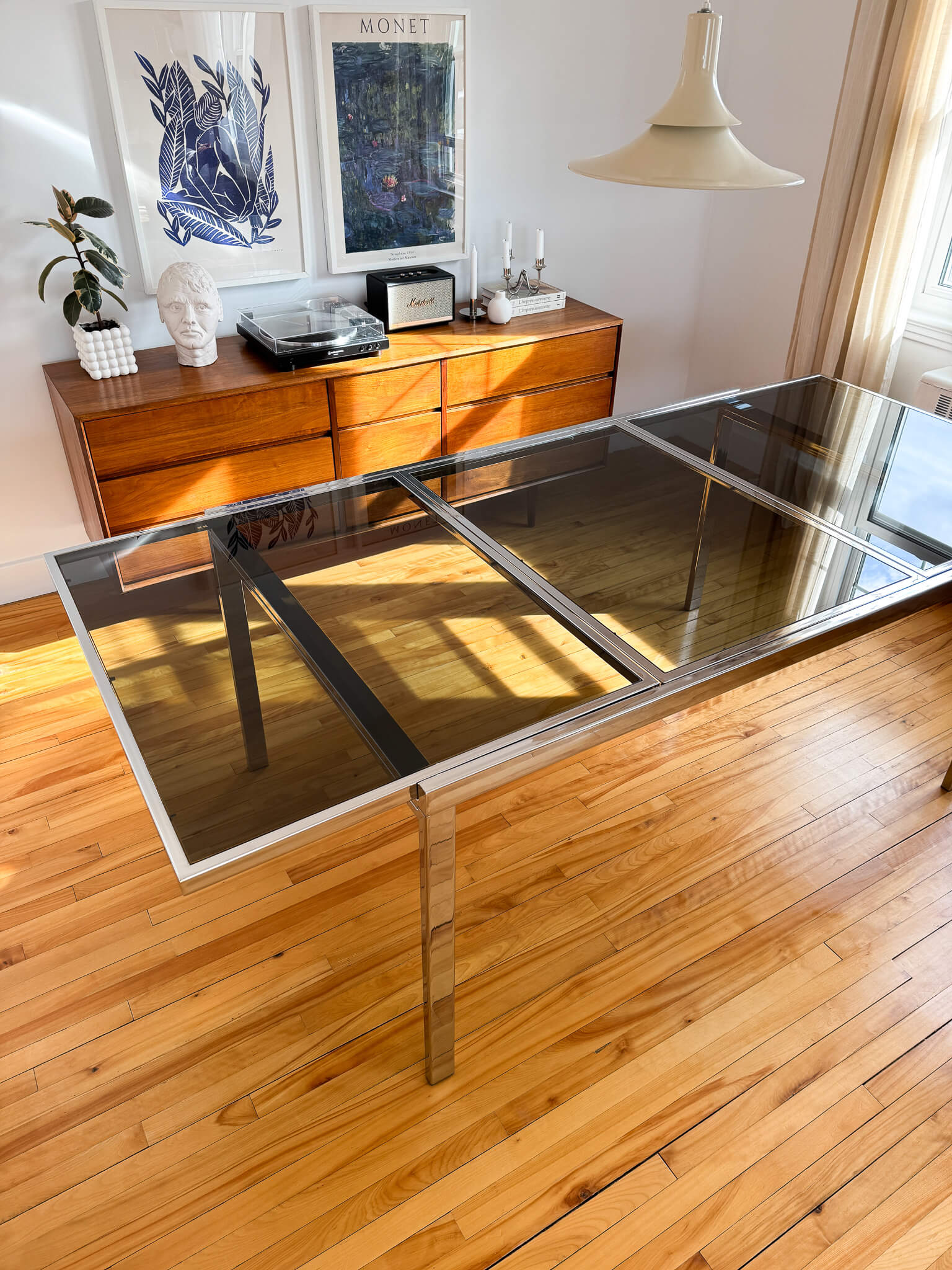 La table est une icône du design américain des années 70, signée Milo Baughman. Sa structure est en acier chromée et elle possède trois panneaux de verre fumé. Elle est dotée d'un ingénieux mécanisme qui permet de positionner le panneau central en dessous ou au même niveau des autres panneaux, afin d'ajouter ou d'enlever la rallonge en toute facilité. Elle peut donc passer de 61 pouces à 86,5 pouces en un tour de main!