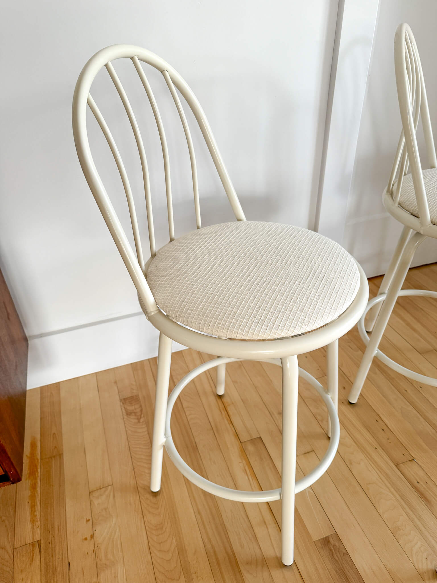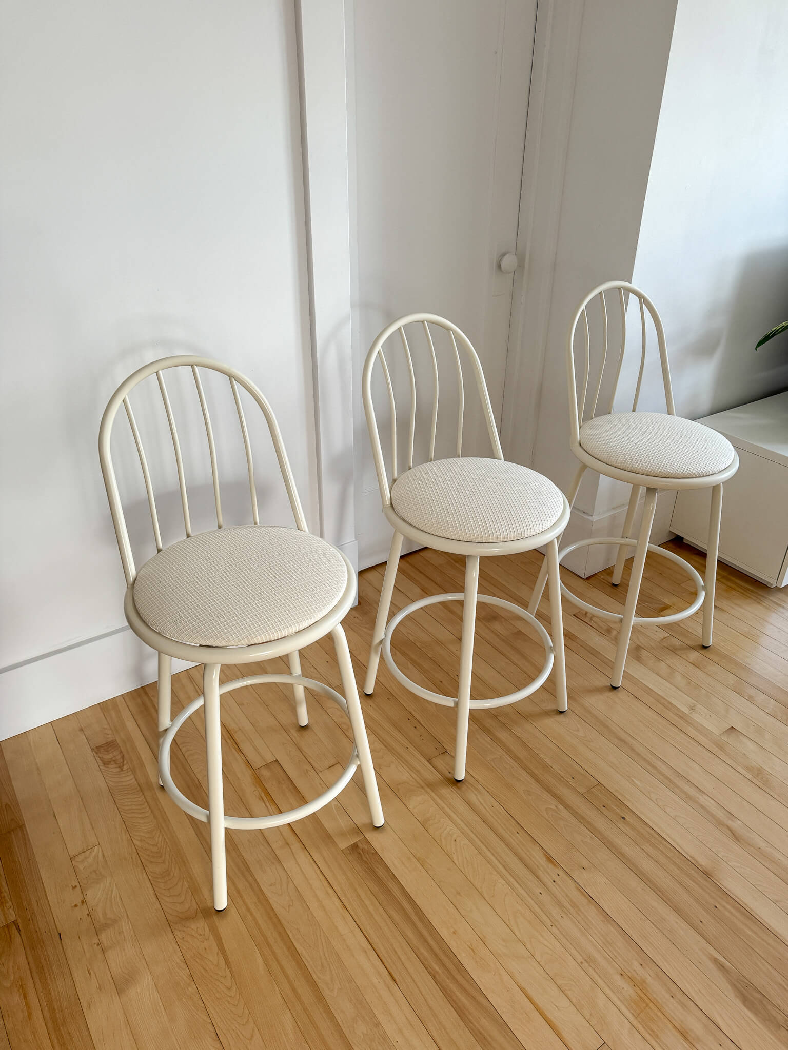 Tabouret rotatif vintage de style postmoderne. Fabriqué en 1991 par la compagnie AMISCO Industries LTD. La structure est en métal blanc et le tissus des assises est en parfait état, puisqu'il était auparavant recouvert de plastique. Le bout des pattes est noir, pareil comme pour les fameux tabourets Paperclips de la même compagnie. La courbe des barreaux du dossier confère un look super intéressant et unique.