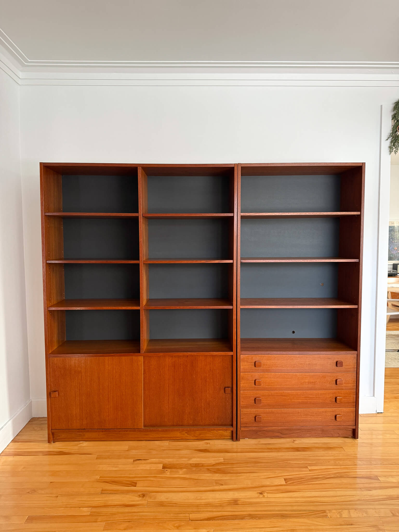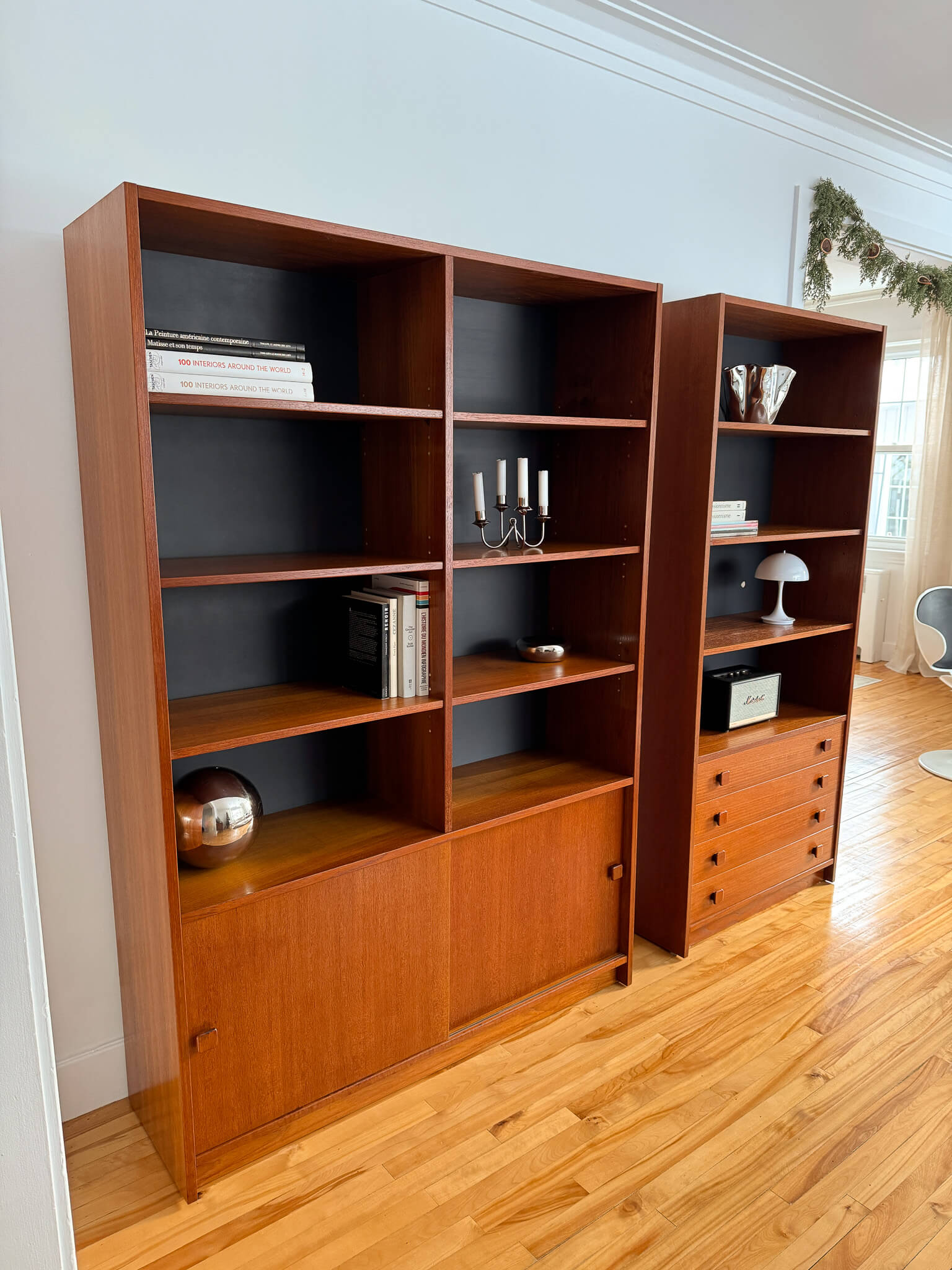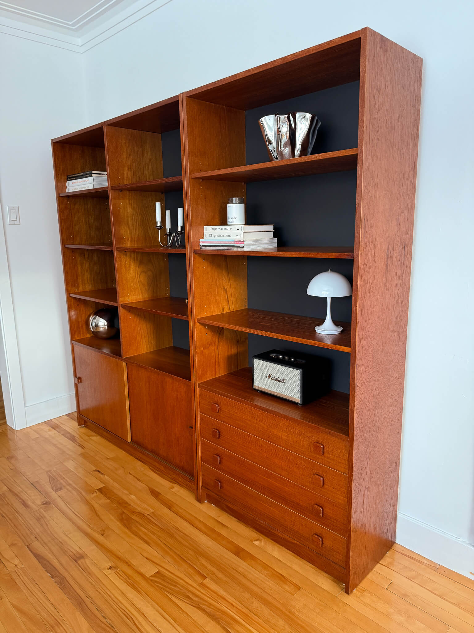 L'une possède quatre tiroirs ainsi que quatre étages de rangement, tandis que l'autre, plus large, possède un rangement avec portes coulissantes dans le bas (contenant deux tablettes) ainsi que huit compartiments de rangement avec tablettes dans le haut.