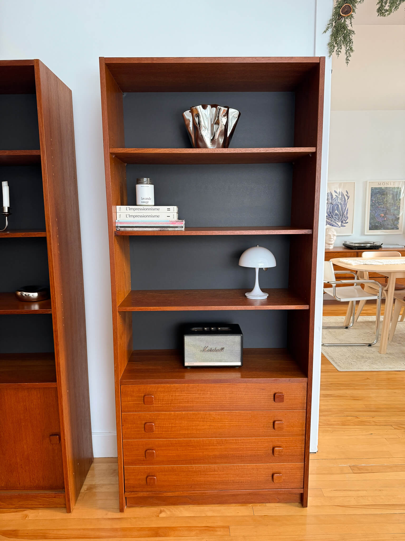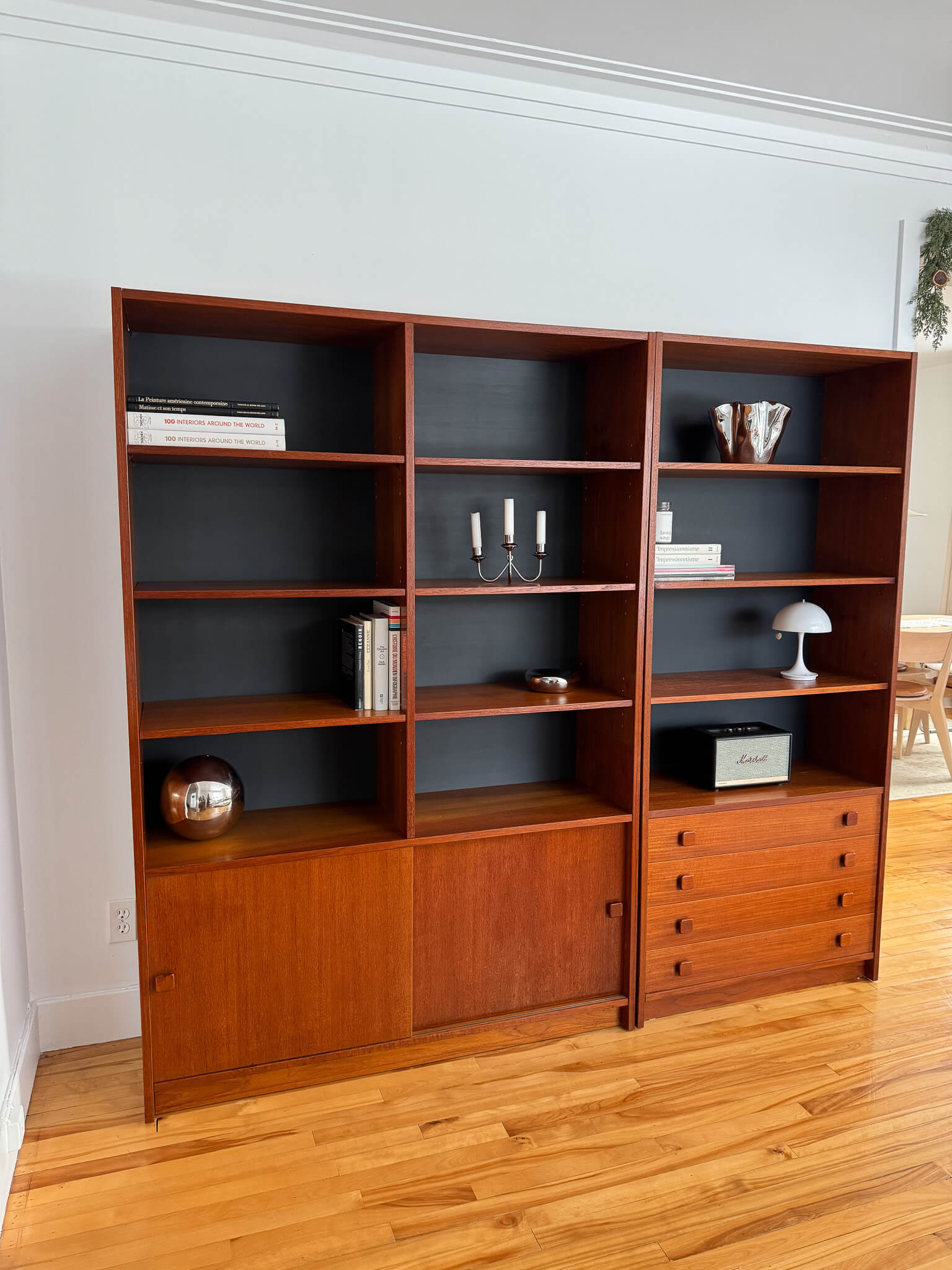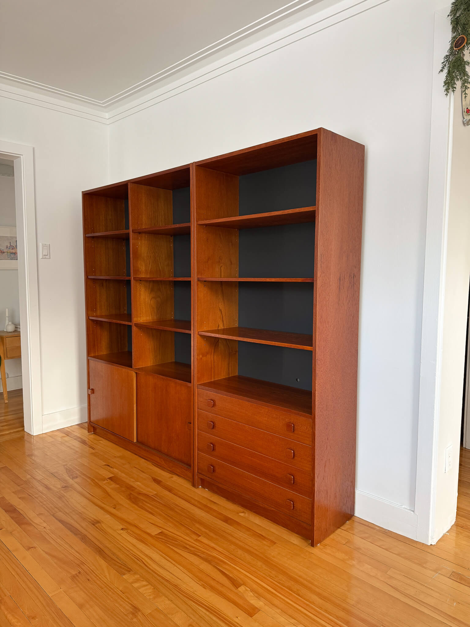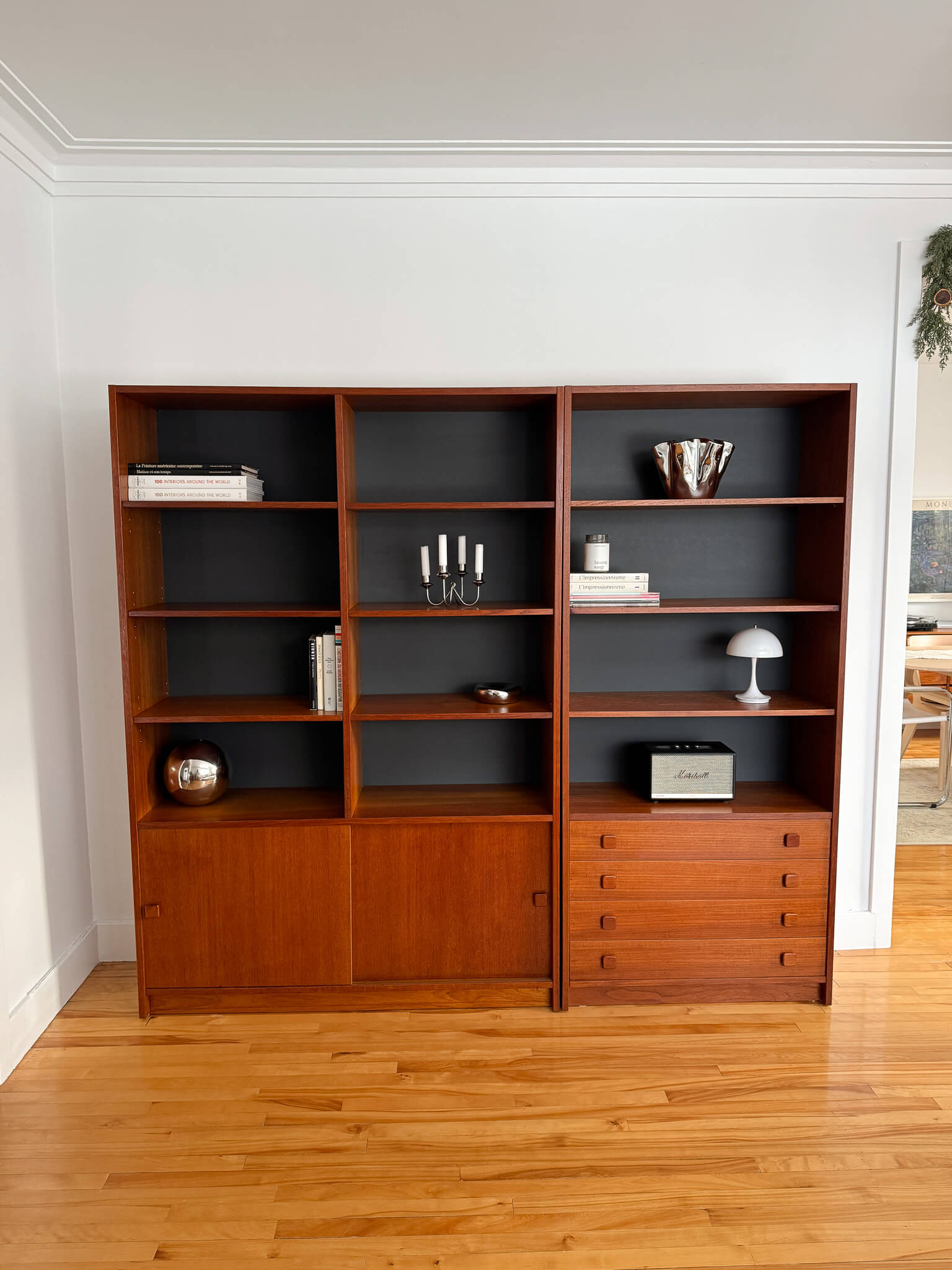 L'une possède quatre tiroirs ainsi que quatre étages de rangement, tandis que l'autre, plus large, possède un rangement avec portes coulissantes dans le bas (contenant deux tablettes) ainsi que huit compartiments de rangement avec tablettes dans le haut.