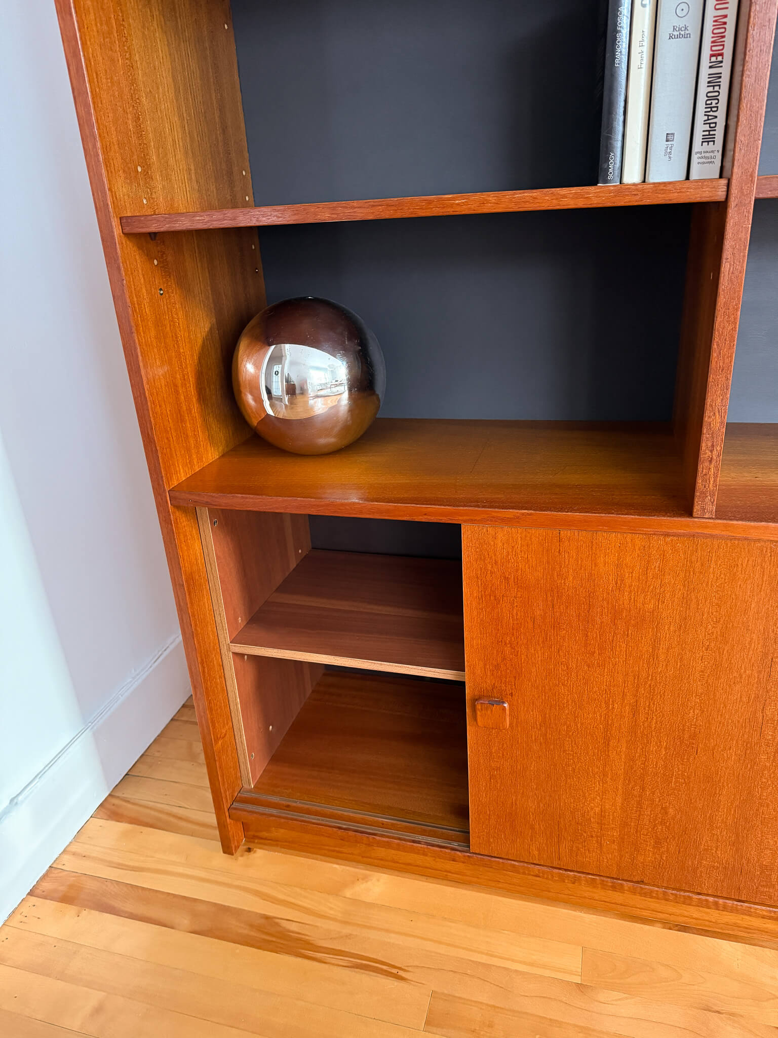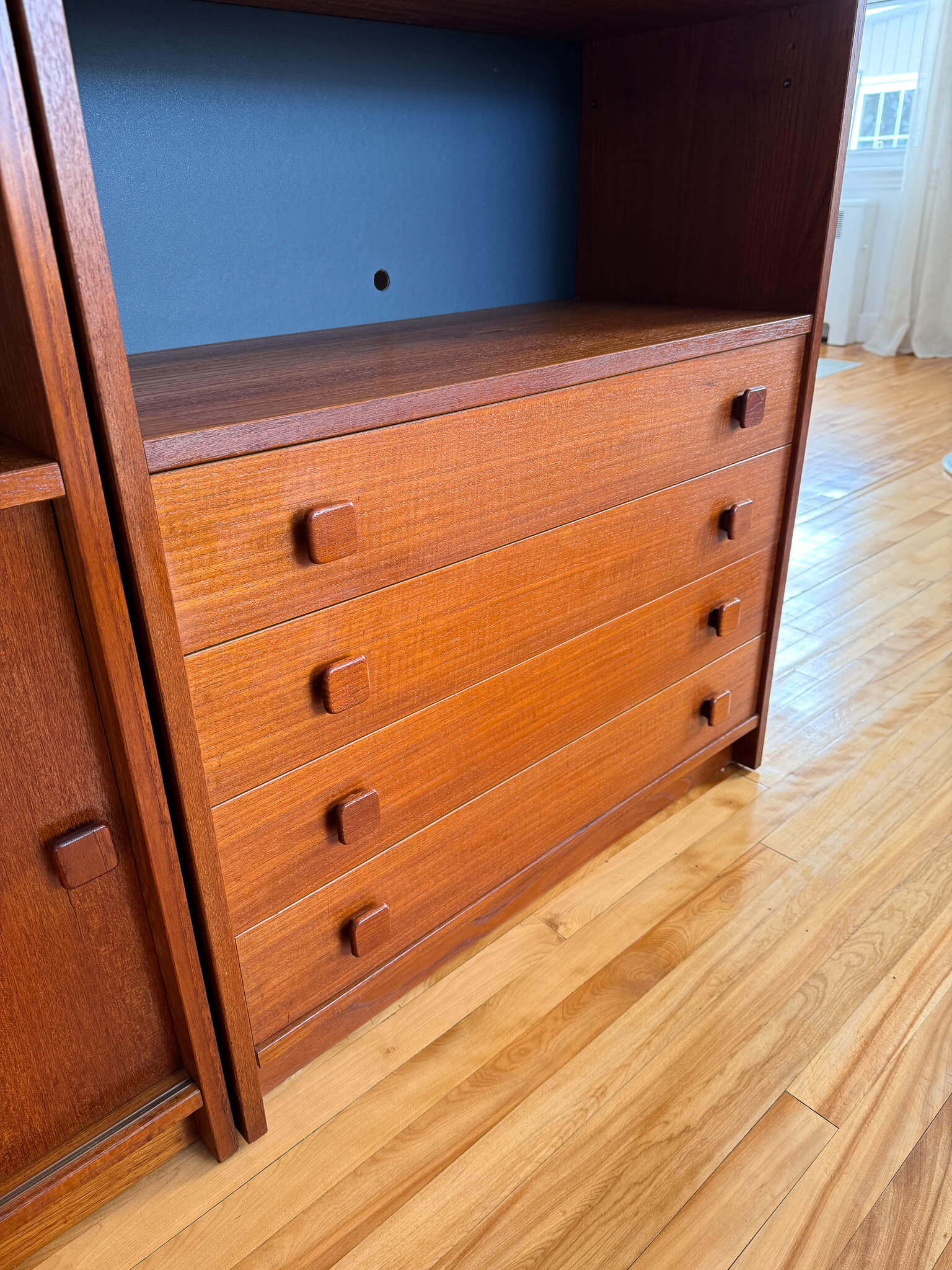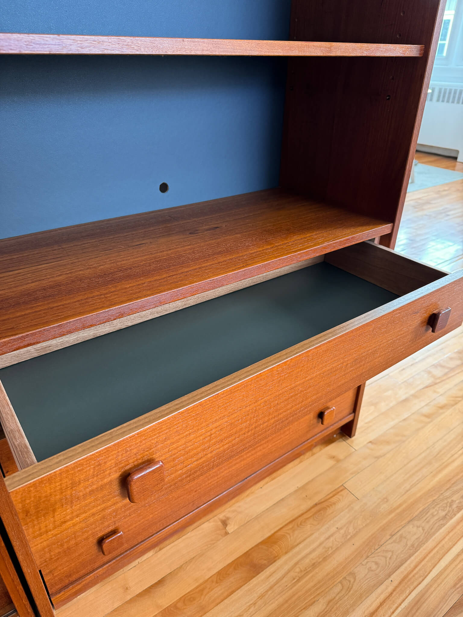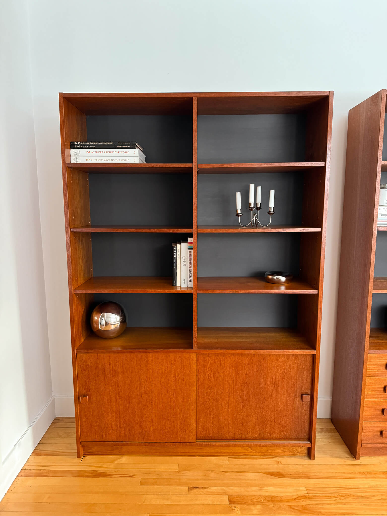 Les deux unités sont en excellent état vintage. Elles ont été réparées, solidifiées, cirées et les panneaux de fond charcoal ont été repeints.