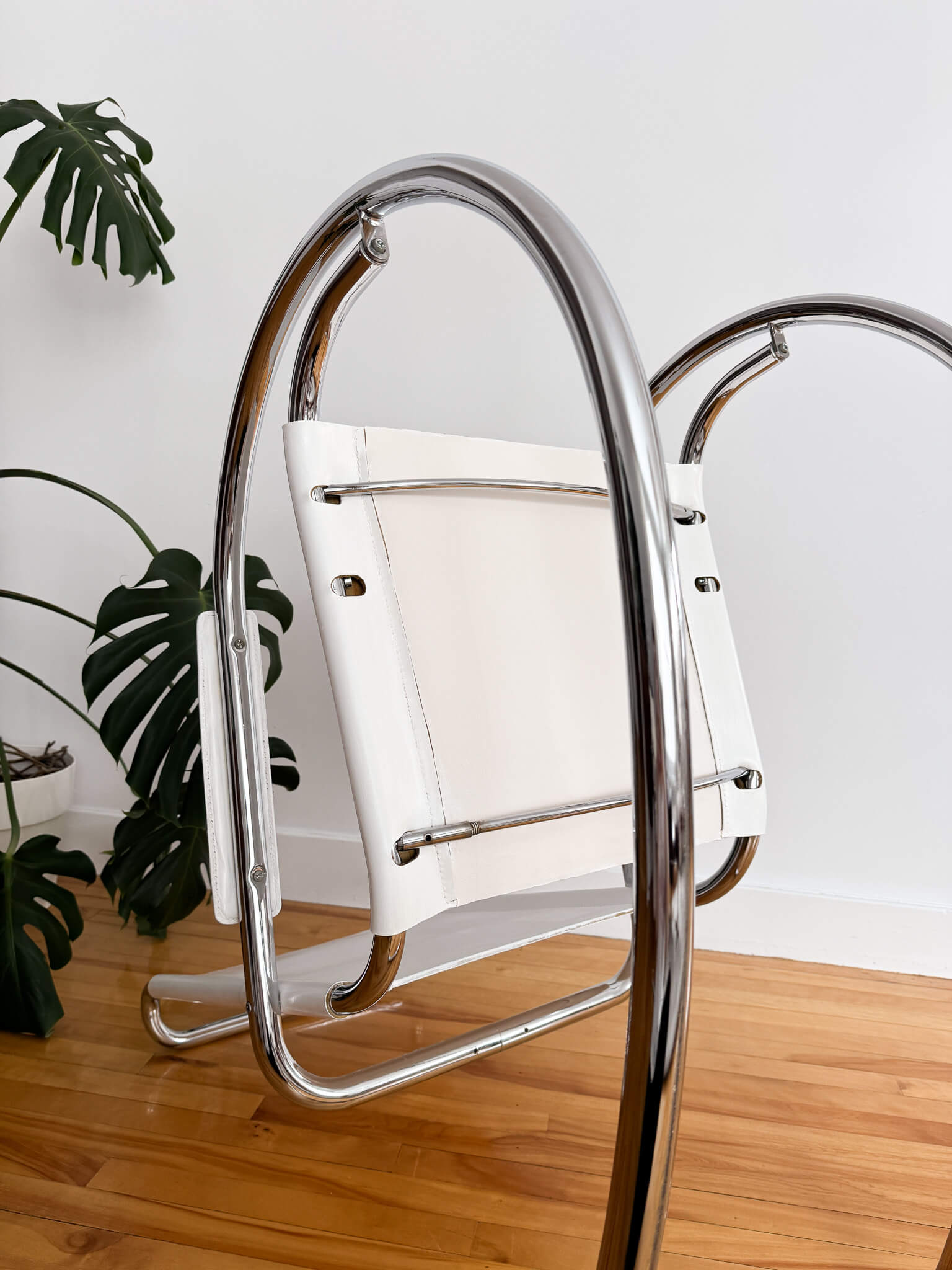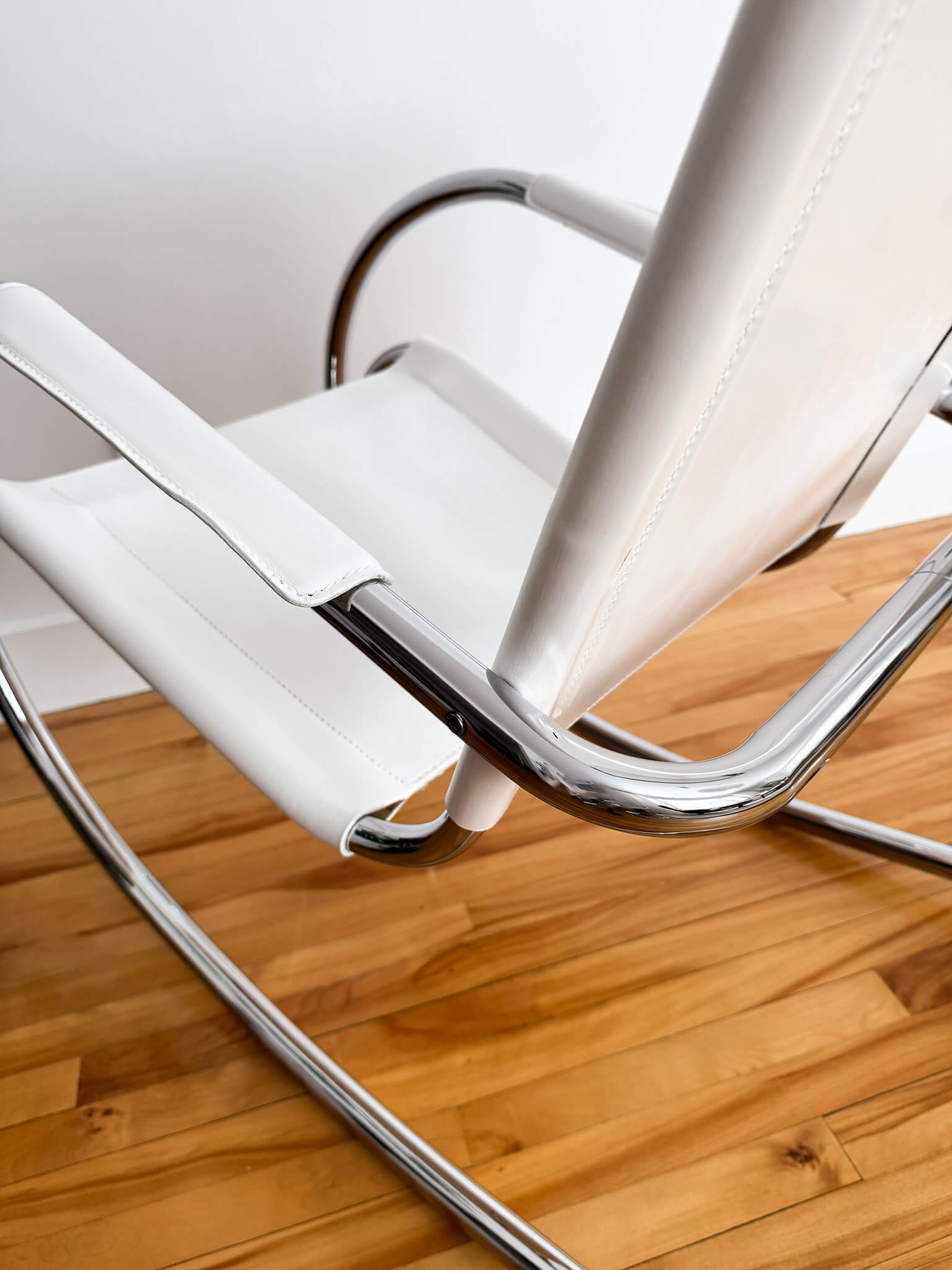 La structure courbée est en acier tubulaire chromé. L'assise, le dossier et les bras sont en véritable cuir blanc.