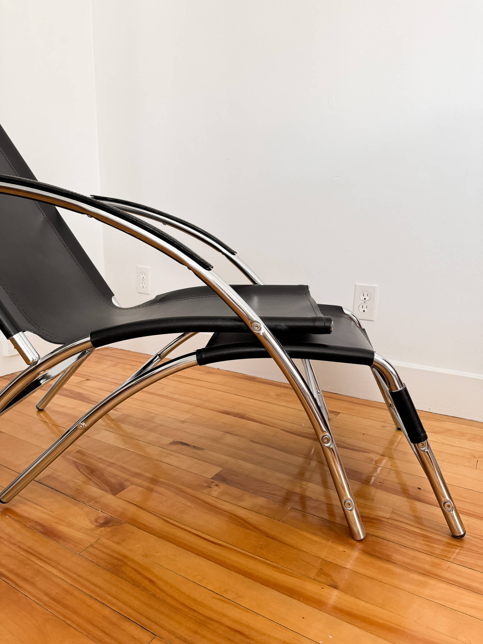 Fauteuil vintage en cuir noir et tubulure chromée Mid-Century