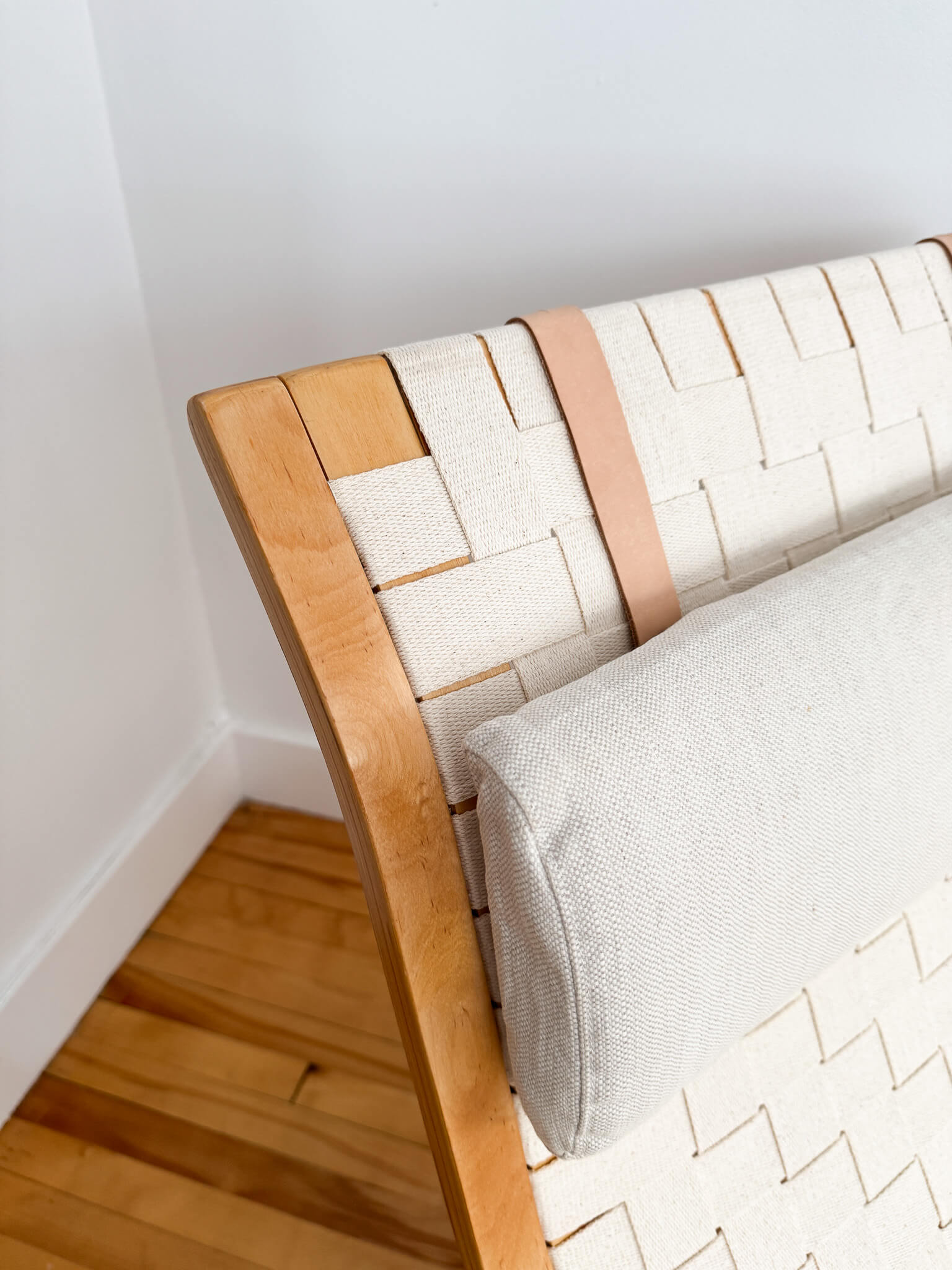 L'assise et le dossier sont constitués de bandes de coton blanches tressées, qui ont entièrement été remplacées par des neuves (identiques à celles d'origine). Un petit coussin pour la tête orne le haut de la chaise et peut être enlevé ou adapté en hauteur grâce à des bandes en cuir végane (neuves). La housse du coussin s'enlève et peut donc être lavée facilement. La base est en bois de hêtre avec un design légèrement organique. Tous les éléments en bois ont été sablés, huilés puis vernis.